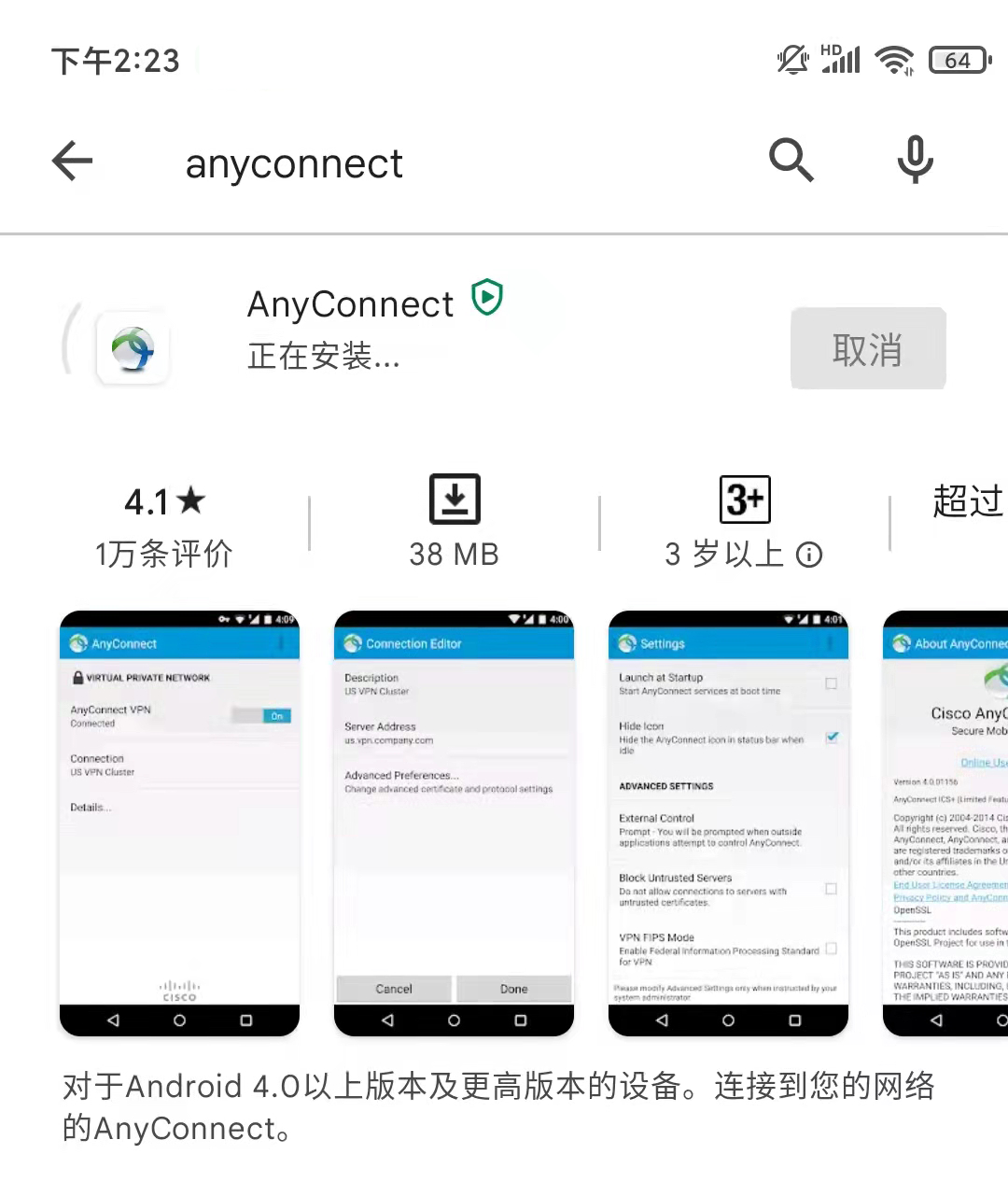 Anyconnect支持Android 4.0内核或更高版本的系统。